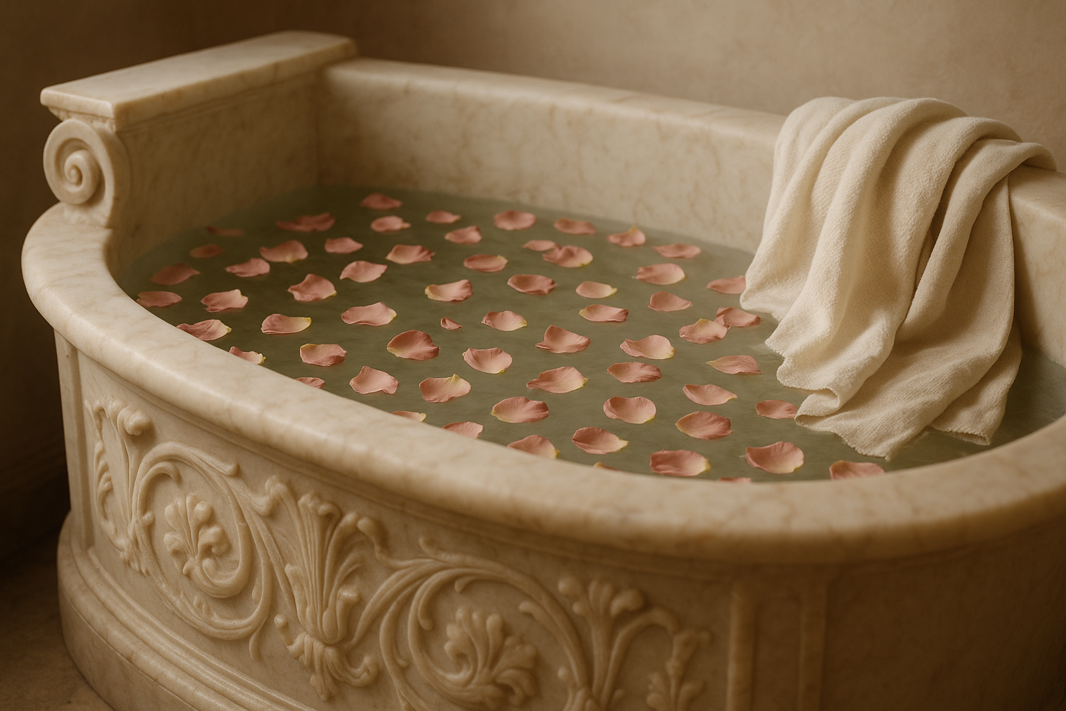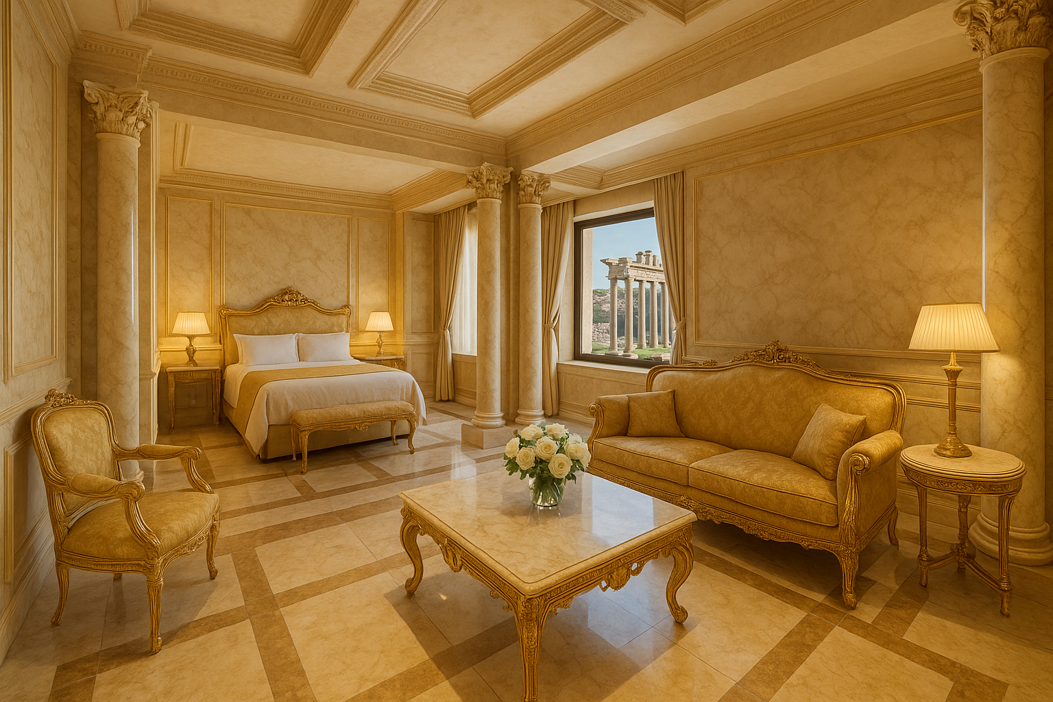 Estilo: Espaços amplos, móveis nobres e decoração em mármore e bronze.